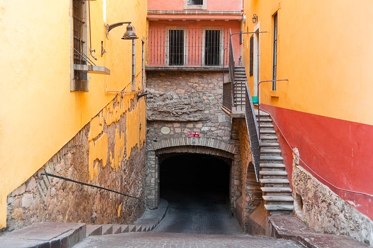 Uno de los aspectos más destacados de un recorrido a pie por Guanajuato es sumergirse en la increíble red de calles y callejones subterráneos de la ciudad. Construidos por necesidad para controlar las frecuentes inundaciones del río Guanajuato, que antaño pasaba por debajo de la ciudad, los túneles quedaron obsoletos tras la construcción de una presa cercana para controlar el río aguas arriba.