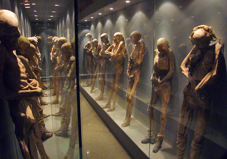 A la espeluznante exhibición se suma el hecho de que algunos de los enterrados aún estaban vivos en ese momento, de ahí las expresiones a veces aterradoras de sus rostros. Además de algunas momias vestidas, el museo afirma tener la momia más pequeña del mundo, un feto.